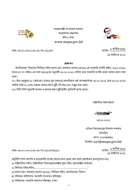 প্রজ্ঞাপনে আরও বলা হয়, তার অনুকূলে ১৮ মাসের মূল বেতনের সমপরিমাণ অর্থ ল্যাম্পগ্র্যান্টসহ ৩১-১০-২০২২ থেকে ৩০-১০-২০২৩ সাল পর্যন্ত এক বছরে অবসর-উত্তর ছুটি পিআরএল মঞ্জুর করা হলো।